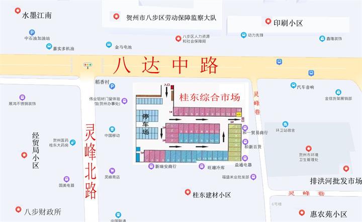 地址位于賀州市八達中路32號,地理位置優(yōu)越,在靈峰北路與八達中路交界處,屬賀州市城區雜貨批發(fā)商圈核心,一墻之隔有三大電信運營(yíng)商,人流密集、交通便利。