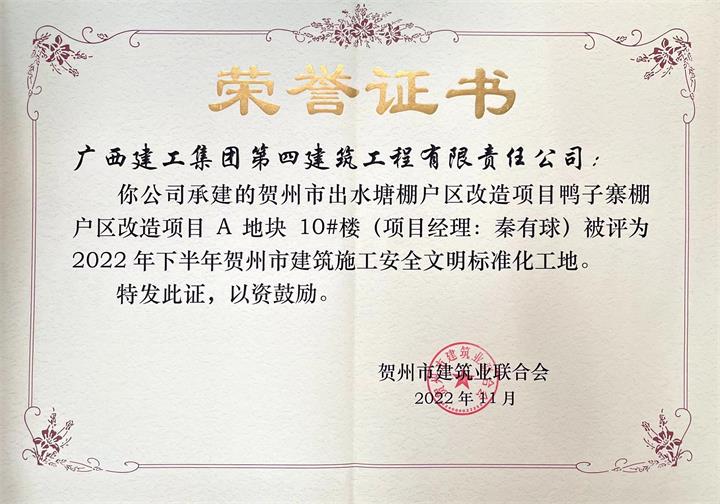 打造“高標準”文明工地。以標準化制度為主線,實現(xiàn)人員“進場流程、安全檢查、安全設(shè)施、安全防護”標準化,建立13個在建項目微信交流群,每日報送項目建設(shè)情況,全方位推進文明工地建設(shè)。公司實施的平安居棚改項目、出水塘鴨子寨棚改項目均榮獲“2022年下半年賀州市建設(shè)工程施工安全文明標準化工地”。