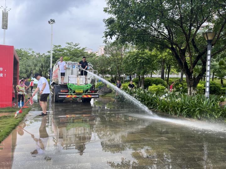 本次清理行動分兩組進(jìn)行,一是加大路面保潔作業(yè)力度,對散落的樹枝、落葉及洪水?dāng)y帶上來的雜物進(jìn)行清理。二是人機(jī)結(jié)合,采取“沖洗+洗掃”聯(lián)合作業(yè)方式,對林蔭小道路面、公園廣場等地進(jìn)行深度沖洗,徹底消除洪水沉積淤泥。